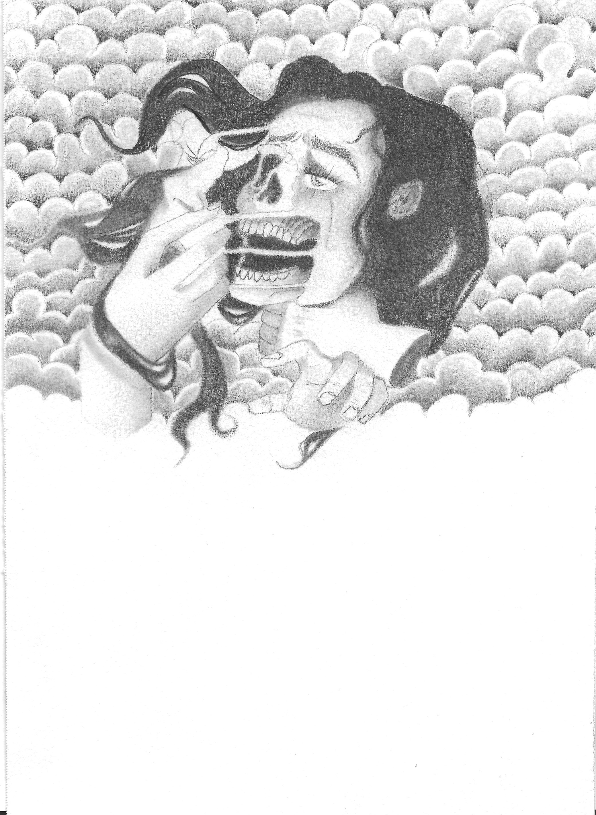 In the drawing a young lady literally removes her face in an obviously painful act of extreme violence. What could have driven her to this? Is she possessed? Is she trying to remove the demon? Or does she have other reasons? Is it fear of change or is she trying to affect change to those around her? The clouds behind her represent idyllic surroundings, a stark contrast to the agony in the foreground.