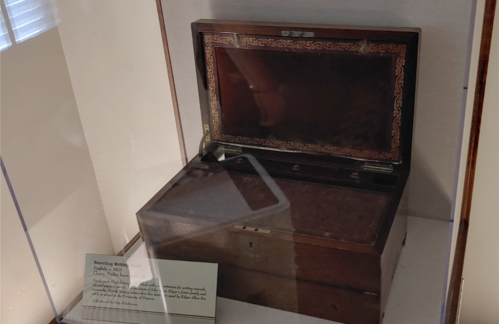 Like laptop computers, most laptop writing desks were placed on desks or tables for use. They allowed a writer to carry paper, pens, and ink with them to write. You could open the top and hang pages to dry and refer to while you worked on the next page. I gather Poe primarily used the desk when he was a student at the University of Virginia. The museum docents couldn’t tell me how heavy the writing box was. I was reminded of the backpack I place my laptop in, but without the convenient straps. The box would have been carried by handles on the side. Still, I wondered if Poe would occasionally take it someplace quiet to work when he needed.